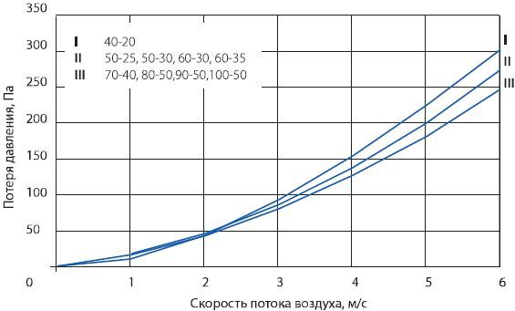 Фильтрующие вставки для кассетных воздушных фильтров изготавливаются из фильтрующих материалов с классом очистки G4 (EU4), также возможен заказ воздушных фильтров с фильтрующей вставкой из материала F5(EU5). При подборе воздушного фильтра для системы вентиляции нужно учитывать падение давления воздуха при прохождении через фильтрующую вставку (кассету) которое можно вычислить по диаграмме: