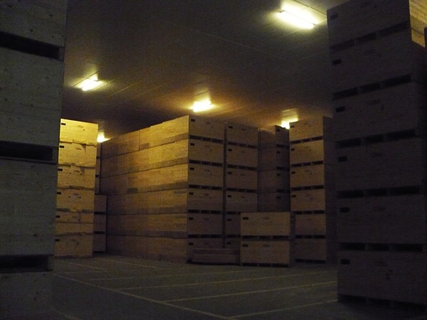 Самым популярным способом хранения картофеля в картофелехранилищах – навальный, что позволяет более эффективно использовать пространство холодильной камеры, облегчает вентиляцию помещения, хотя, этот способ не такой удобный как тарный, когда вся продукция хранится в ящиках и доступна к отгрузке небольшими партиями(возможен высокий уровнь механизации загрузки и выгрузки продукции). Максимальная высота складирования при навальном способе хранения 5 метров и зависит от плотности клубней, условий вентиляции.
